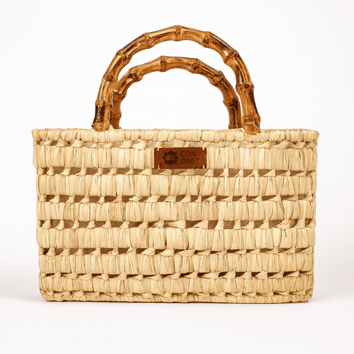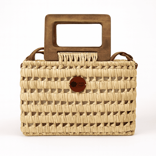 Couffin artisanal en fibre végétale avec plusieurs modèles de poignées : bois, bambou ou cuir décoré. Pièce unique, élégante et pratique.