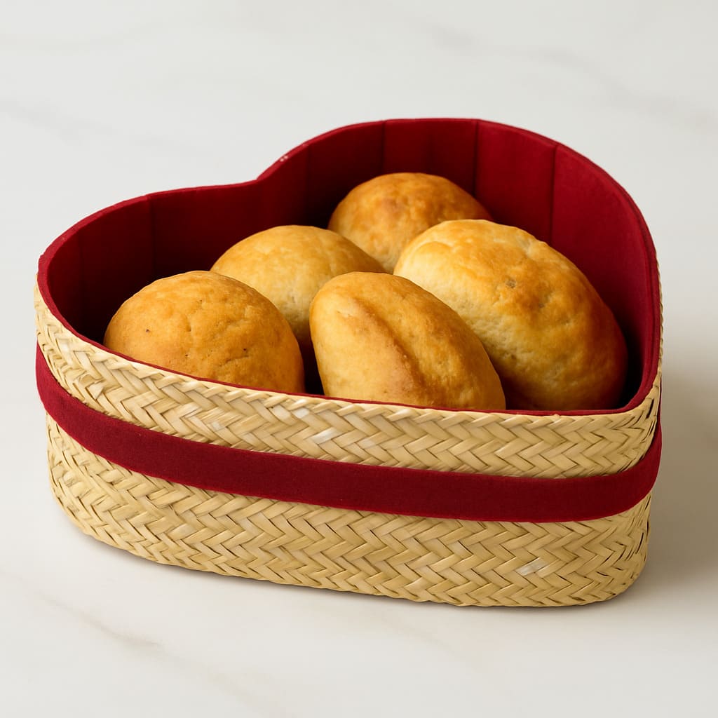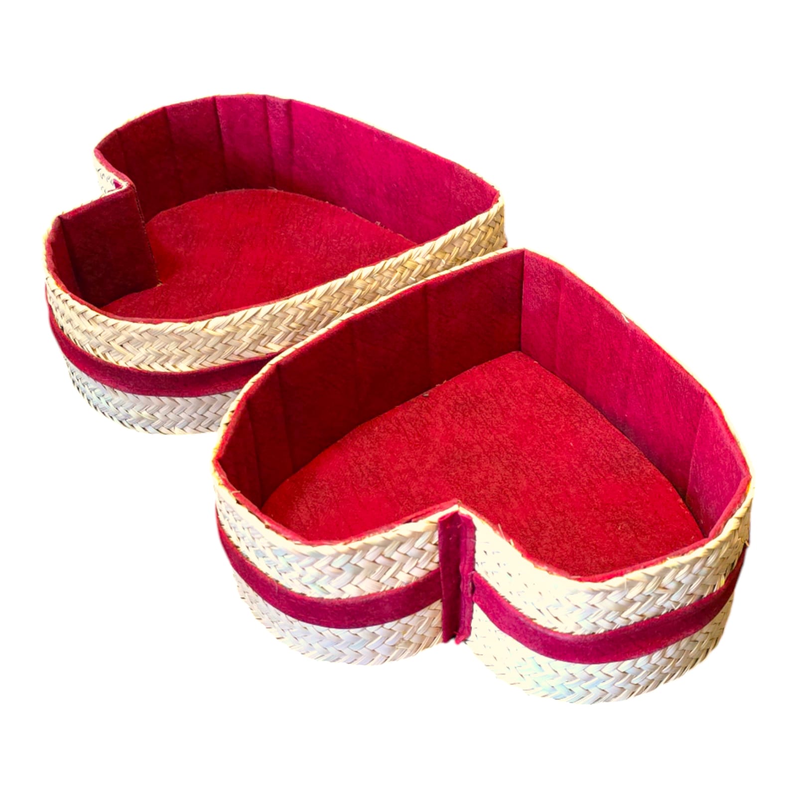 Sublimez votre table ou votre intérieur avec ce duo de corbeilles artisanales en forme de cœur, tressées à la main en nattes naturelles et doublées d’un tissu rouge foncé. Le lot inclut deux tailles assorties : une grande et une plus petite corbeille, pour un rendu harmonieux et pratique. Idéales pour présenter du pain, des fruits, ou même comme coffrets cadeaux romantiques.